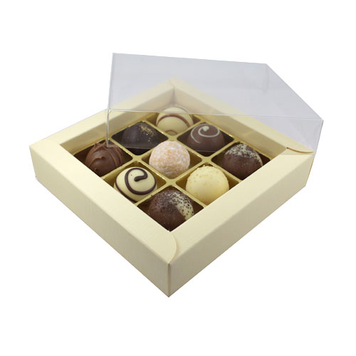 Diese edle Trüffelbox für 9 Trüffel oder Pralinen ist die ideale Verpackung für Ihre Produkte. Durch den breiten Rand und die abgerundeten Papierübergänge wirkt sie hochwertig und edel. Die Schachtel wird aufgebaut geliefert, ist auch ohne Blister verwendbar und lieferbar in anderen Farben.